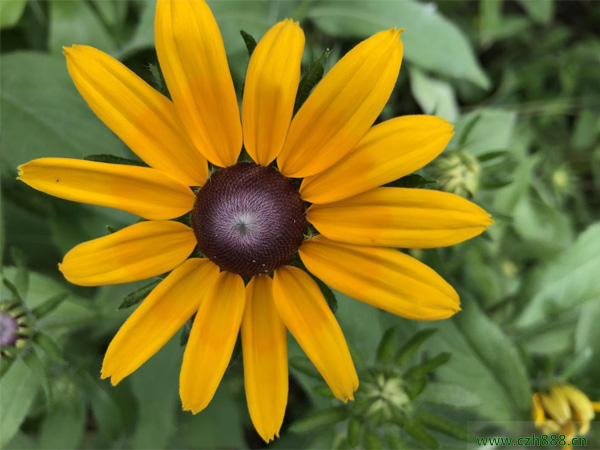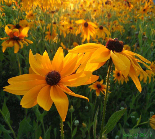 金光菊為菊科金光菊屬,為多年生草本植物,一般作1- 2年生栽培。枝葉粗糙,株高可達2米,多分枝。葉片較寬,基部葉羽狀分裂,5-7裂;莖生葉3-5裂,邊緣具稀鋸齒。頭狀花序一至數個春生於長梗上。舌狀花單輪,倒披針形而下垂,長3Cm左右,金黃色;管狀花黃綠色,花期7-9月。