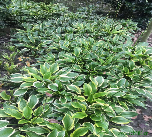花葉玉簪為百合科玉簪屬宿根草本植物,株高約40厘米,葉基生成叢,具長柄,葉片卵形至心狀卵形,基部心形,具弧狀脈,頂生總狀花序,花葶高出葉片,著花9-15朵,每花被1苞片,花白色,管狀漏鬥形,徑約2.5-3.5厘米,長約13厘米,裂片6枚短於筒部,雄蕊6枚,花柱極長,蒴果三棱狀圓柱形,花期6-8月,芳香。